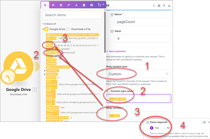 Scroll down to review more of the HTTP module's configuration. Select Custom as the Body Content type (1), then from the Google Drive module select the Mime Type as the Content type value (2) and Data as the Body content (3). Leave the Parse response set to Yes (4) so that the response returns only the returned JSON.