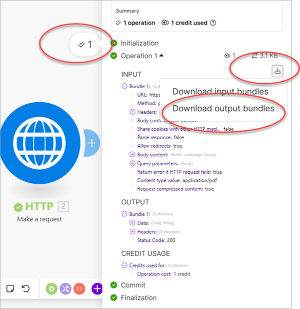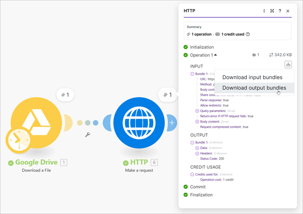 After creating the HTTP request, select Run once to run the scenario. After successfully running the scenario, open the results and select Download output bundles to review the JSON results.