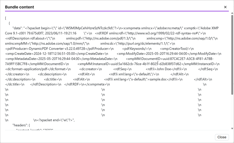 The pdf-security-info endpoint, like the previous three endpoints, also takes a PDF as raw binary. The endpoint returns a PDF document's security information as JSON.