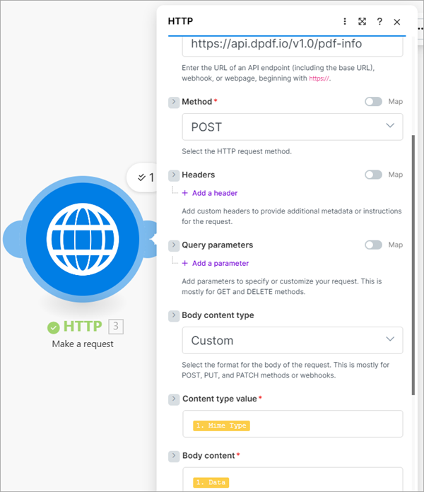 The pdf-text, pdf-xmp, pdf-info, and pdf-security-info endpoints all accept raw binary data as the body of an HTTP POST request. When calling these endpoints from Make.com, you configure the HTTP module to send the file contents directly as binary payload rather than as form data. The following four examples demonstrate how to upload a file as raw binary and process the resulting response from each endpoint.