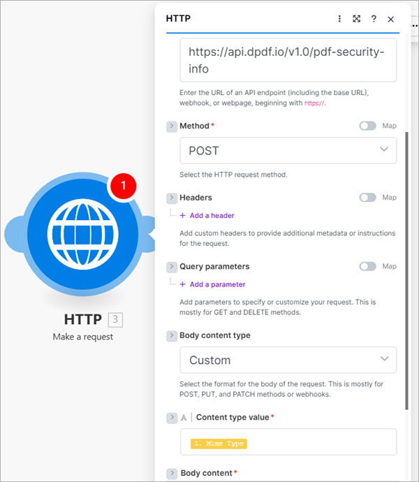 There are two distinct ways to call the DynamicPDF API endpoints, depending on how the request body is structured. Some endpoints accept raw binary data sent directly in the body of an HTTP POST request, while others require a multipart/form-data submission. The pdf-text, pdf-xmp, pdf-info, pdf-security-info, and image-info endpoints accept raw binary payloads, where the file itself is posted as the request body. In contrast, the pdf-image, dlex-layout, and pdf endpoints require multipart form submissions to support multiple inputs and named fields. Make’s built-in HTTP module supports both request patterns, which is illustrated throughout this blog’s examples.