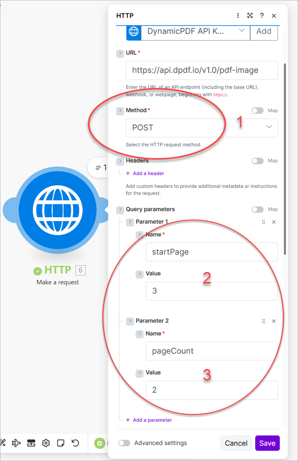 Add a new HTTP module, add the pdf-image endpoint URL and change the Method to POST (1). Add two query parameters so you only rasterize pages three and four by setting startPage to 3 (2) and pageCount to 2 (3).