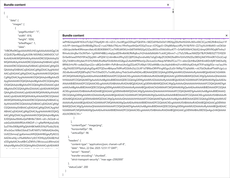 Run the application and then select Download output bundles to view the returned JSON that contains the two rasterized images as base64 data.