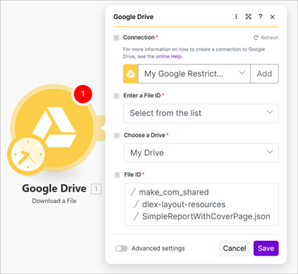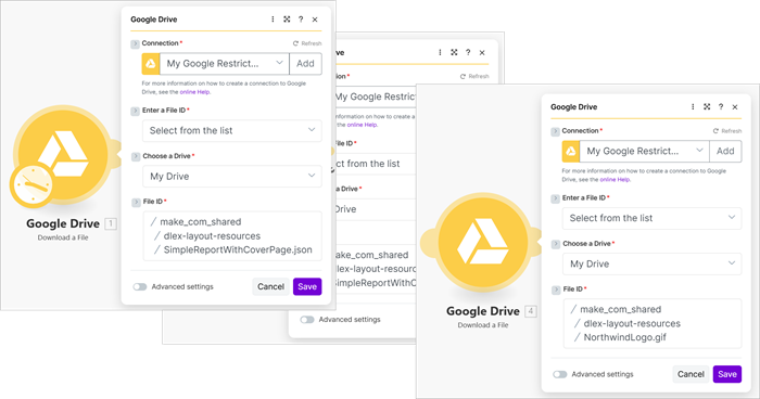 In the previous example, you specified the DlexPath as a text form field containing the relative path to a DLEX template stored in DynamicPDF API cloud storage. If instead you want to rely entirely on files from your own environment and avoid using DynamicPDF API storage, you can upload the DLEX template and any supporting assets directly as form files using the Resource field. In this situation, the DLEX file, embedded images, and JSON data are all sent as part of the same multipart/form-data request. For example, assume the DLEX template (SimpleReportWithCoverPage.dlex), an embedded image (NorthwindLogo.gif), and the JSON data (SimpleReportWithCoverPage.json) are all stored in your Google Drive. Add a Google Drive module that downloads each of these files so they can be included as resources in the HTTP request to the dlex-layout endpoint.