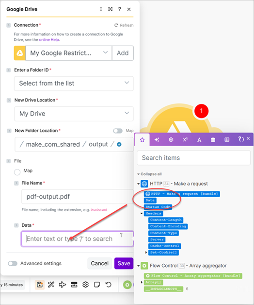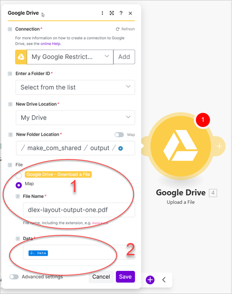 To view the PDF returned from the dlex-layout endpoint, add a new Google Drive module with the Action of Upload a File. Assume you have a folder entitled output on your Google Drive to output the created PDF. Assign the name you wish to save the PDF as to the File Name field (1) and map the Data to the Data from the HTTP module (2).