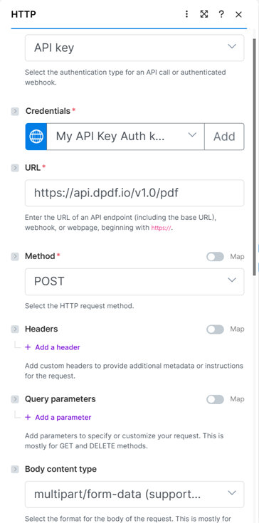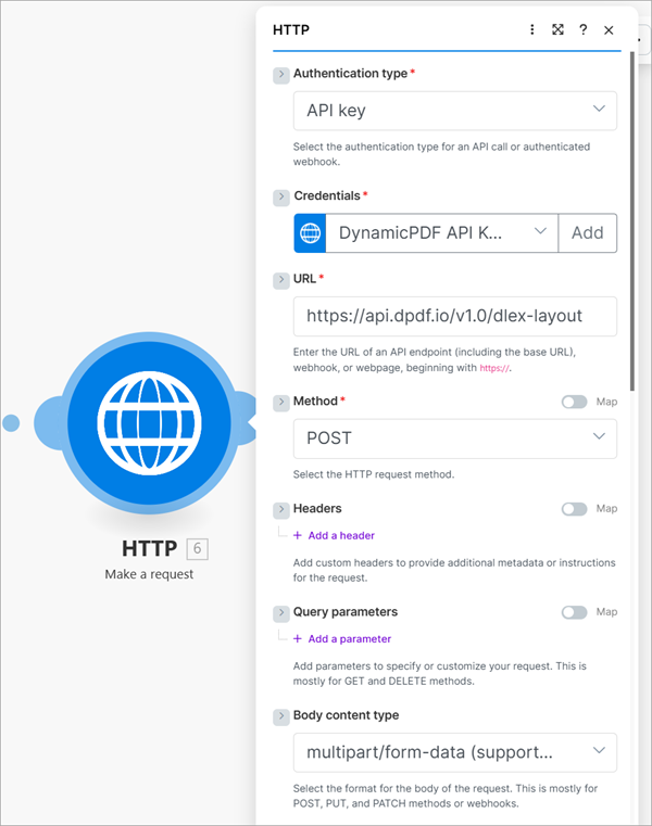 The HTTP module allows you to define authentication, request headers, query parameters, HTTP methods, and request body formats. It is a versatile module, and by using it, you can easily call every DynamicPDF API endpoint without writing any code.