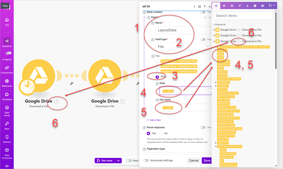 For the Body content, add a field named LayoutData (1), set the Field type to File (2) and then select Map (3) to display Data and File name. Add the Data to Data (4) and Name to the File name (5). Be careful to select the correct Google Drive module containing the file to download SimpleReportWithCoverPage.json (6).
