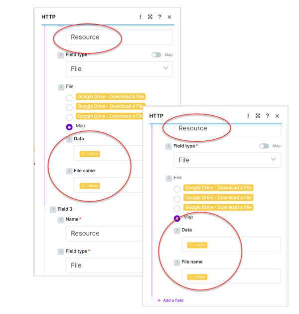 Change the Body content type to multipart/form-data (1) and then assign pdf to Name (2) for Field 1. Assign File (3) as the Field type and select Google Drive - Download a File as the File (4). By selecting (4) Make.com automatically assigns the file's data to the Google Drive module's Data and file's name to the Google Drive module's Name.