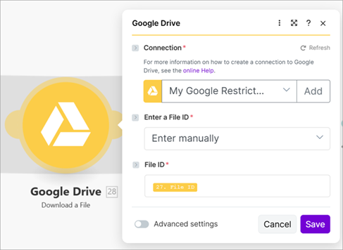 Next, connect a Google Drive module and set its action to Download a File. Connect the File ID to the File ID property from the previous module's search for files. This ensures each file is also downloaded from the drive's folder.