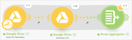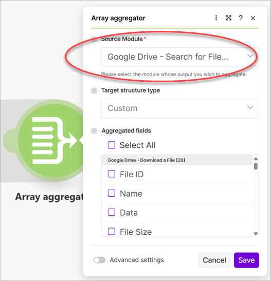 Add an Array Aggregator and select Google Drive - Search for Files/Folders as the Source Module.