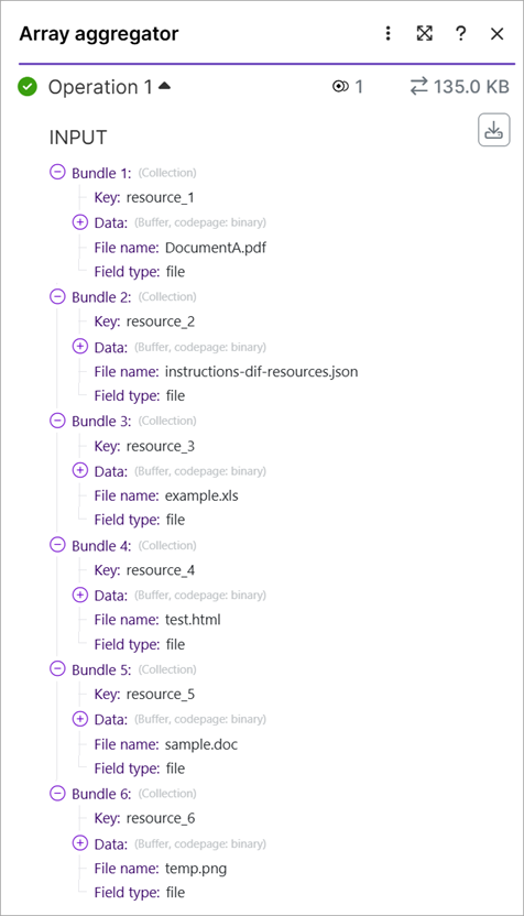 Open the aggregator's results and expand the input bundle and note each resource and its position in the array.