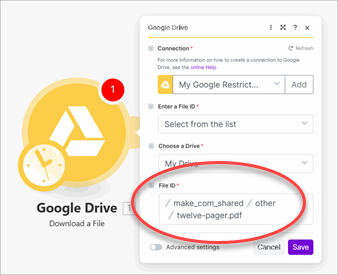 In this example, once again assume you have a twelve-page PDF document named twelve-pager.pdf stored in your Google Drive. Add a Google Drive module to the scenario, select Download a File, and choose the PDF you want to send to the pdf-image endpoint.