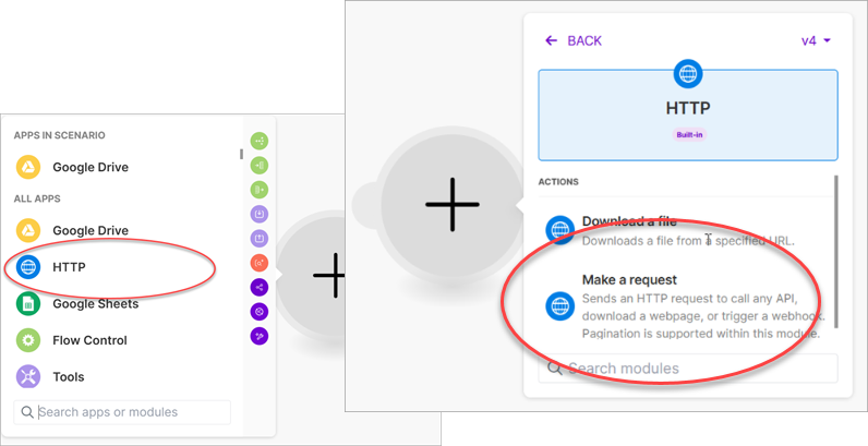 After adding the Google Drive module, add an HTTP module and choose Make a request from Actions.