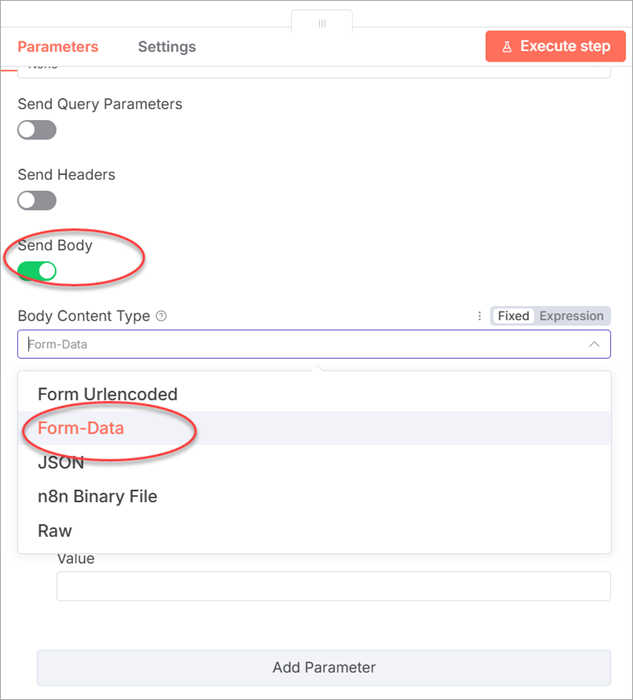- Toggle Send Body and select n8n Binary File as Body Content Type.