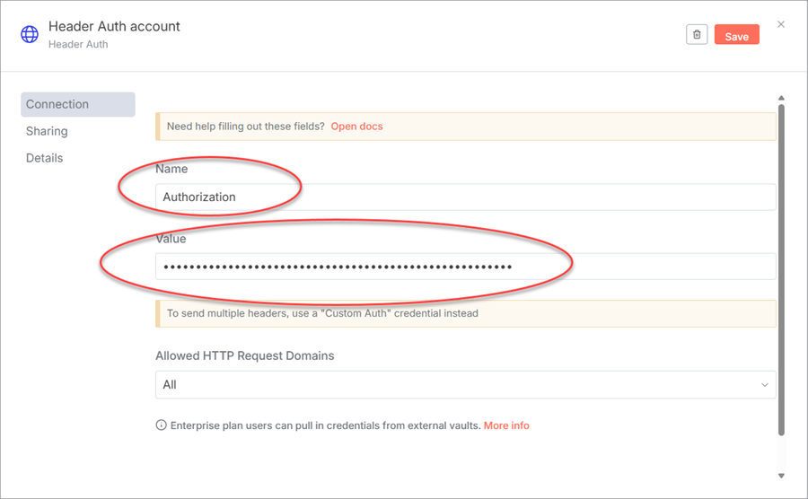 - Configure the Header Auth account with Authorization as Name and