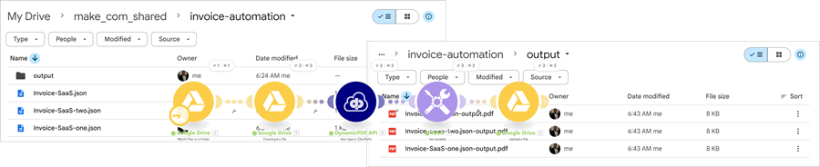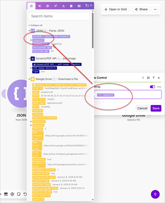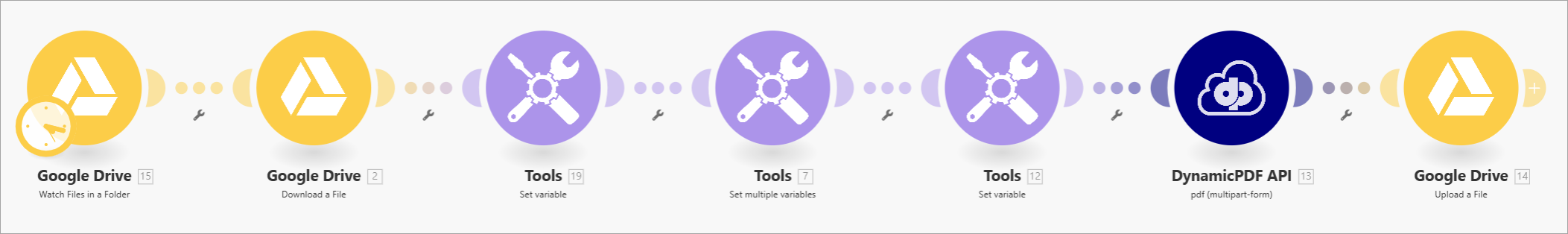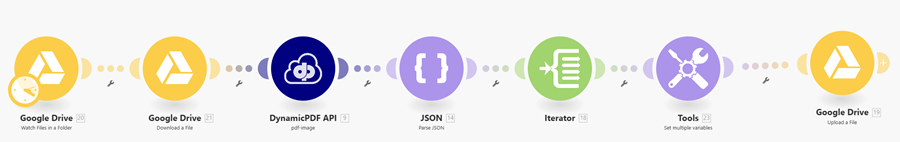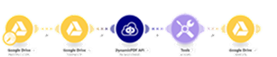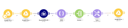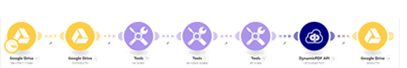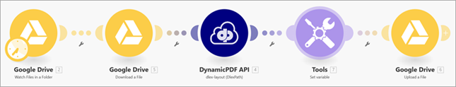 See the tutorial Using the DynamicPDF API Make App for detailed instructions on constructing a scenario using the Google Drive App, JSON, Iterator, and Tools built-in apps.