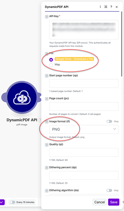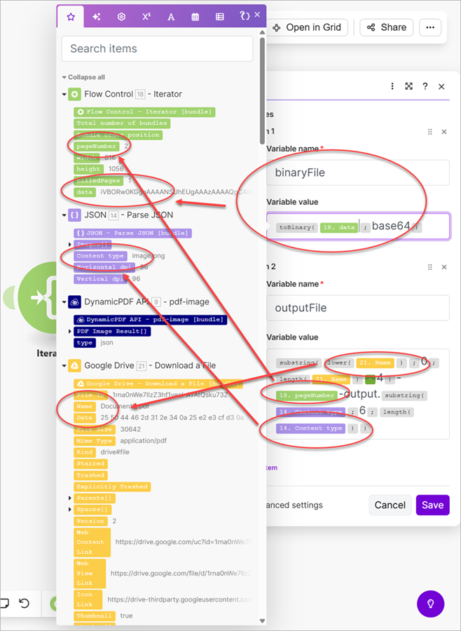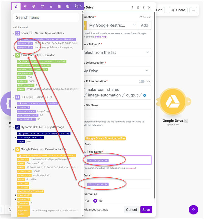 - Add a Google Drive Upload a File module and save the created binary image as a file on Google Drive.