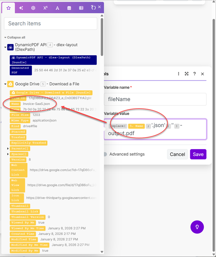 fileName, Variable value as the Name from Google Drive Download a File, and remove the JSON extension from the file name.