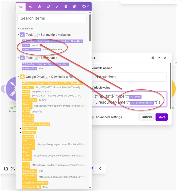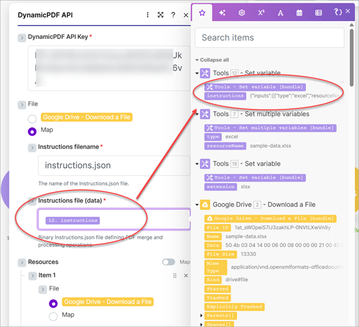 instructionsvariable's value to the Instructions file (data) and assign the Resource to the file from the Google Drive Download a File module.