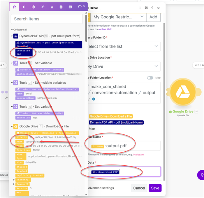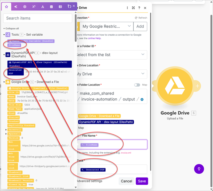 - Add a Google Drive Upload a File module and map the File Name to the fileName variable and the Data to the Generated PDF.
