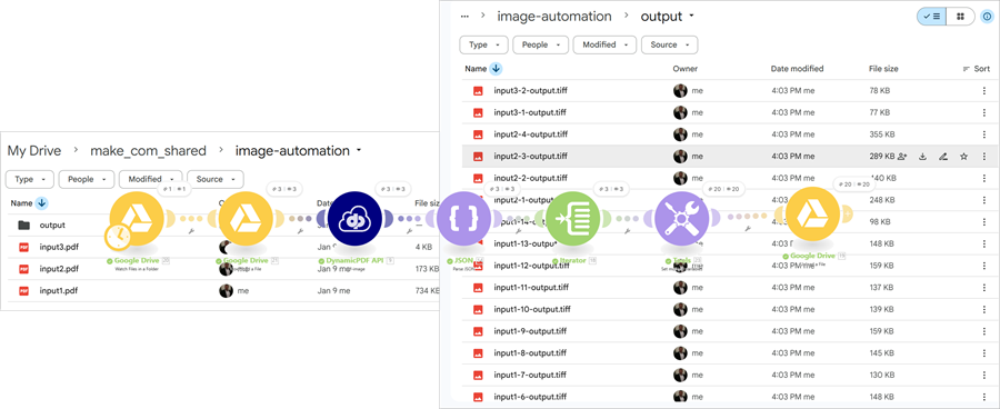 Watch a Google Drive folder for new PDF files, retrieve each file, and send it to the DynamicPDF PDF API pdf-image custom Make module to rasterize the pages as TIFF images. The workflow parses the JSON response, iterates over the images array, and converts each page’s base64 image data into a binary file. For each page, it builds an output filename from the original PDF name, the page number, and the content-type-derived extension, then uploads the resulting image files to a designated Google Drive output folder.