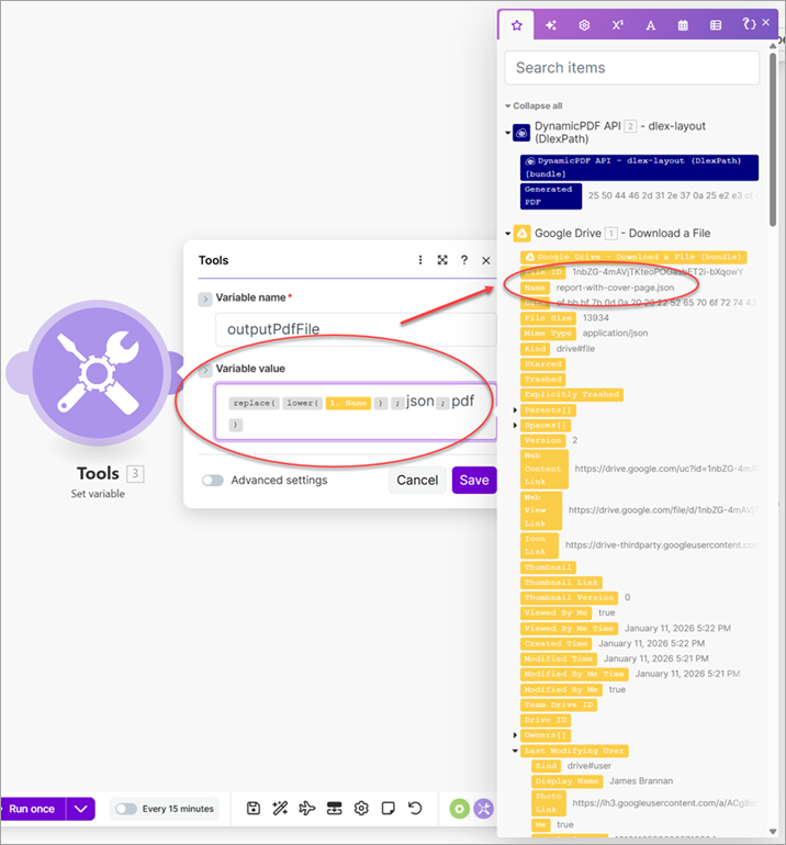 outputPdfFileas the Variable name, and parse the Name from Google Drive - Download a File to replacejsonwithpdf(Tools - Set variable).