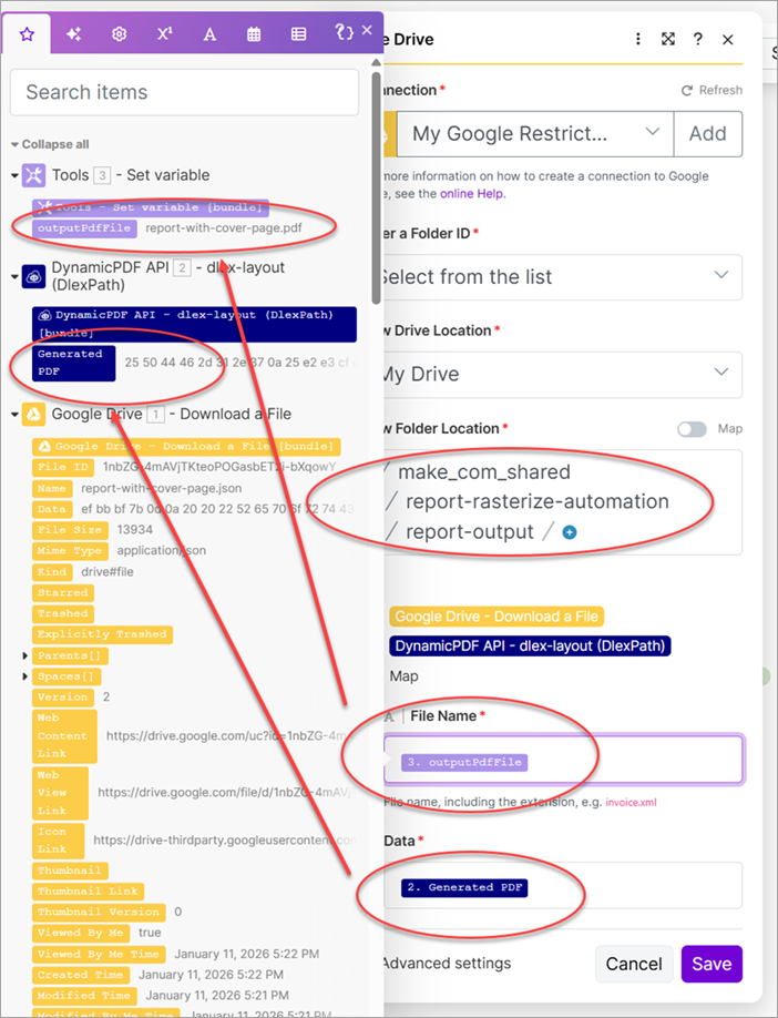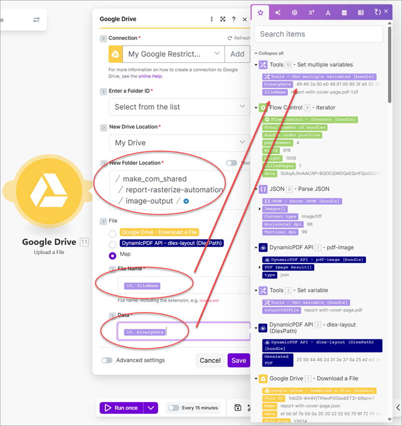 - Add a new Google Drive - Upload a File module to the scenario. Map the