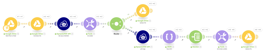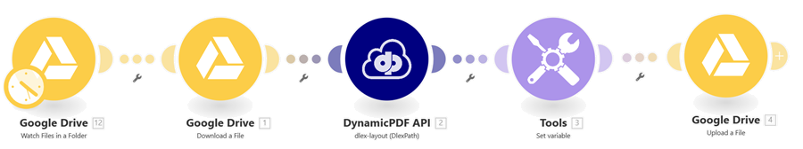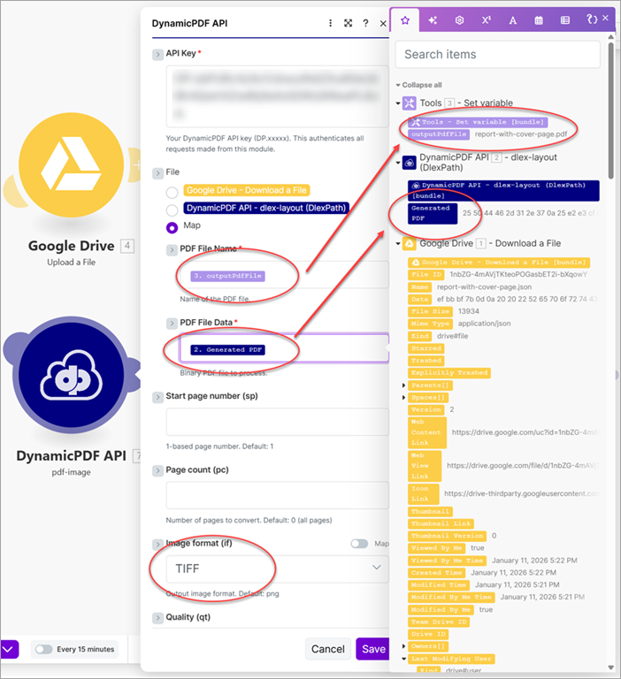 Learn how to use the DynamicPDF API custom Make app by building a scenario that combines the dlex-layout (DlexPath) and pdf-image modules to generate PDF reports and rasterize them directly within Make.In this tutorial, you’ll build a Make scenario that batch-generates DLEX reports from files in a Google Drive folder, saves each resulting PDF, and then rasterizes those PDFs into TIFF images. Both the PDF reports and their corresponding TIFF outputs are written back to Google Drive. This walkthrough demonstrates a practical, real-world workflow that shows how easily the DynamicPDF API can automate document generation and downstream processing.