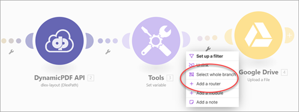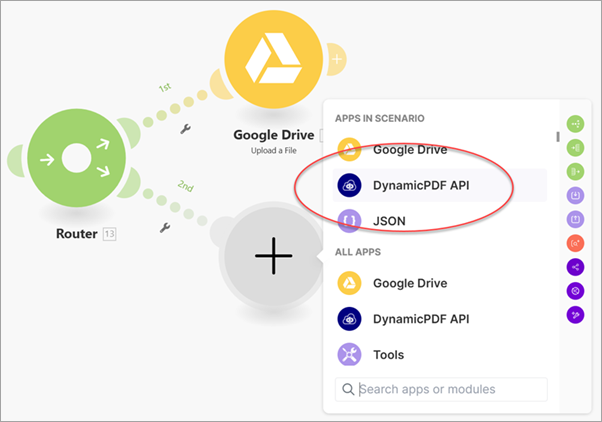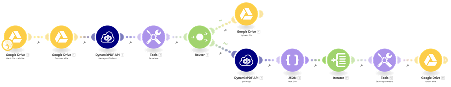 Add a Router so the scenario can also route the generated PDF reports to the DynamicPDF API pdf-image module for rasterization, and then pass the resulting images to a Google Drive - Upload a File module to save the rasterized outputs to Google Drive (Router).