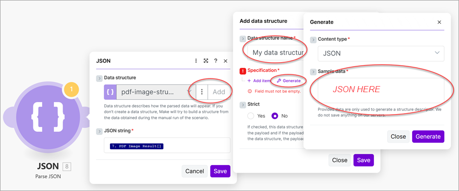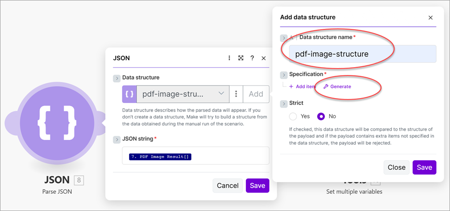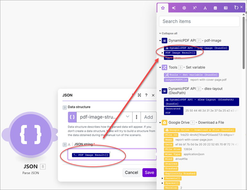 - Add a JSON - Parse JSON module and map PDF Image Result to the JSON string.