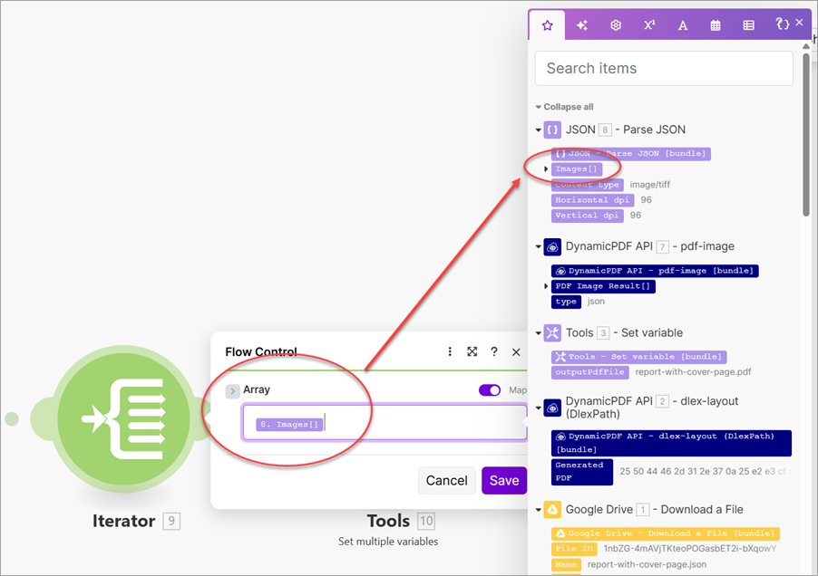 Images[]from the JSON - Parse JSON module (Iterator).