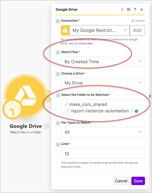 - Add a Google Drive Watch - Files in a Folder module and configure it to monitor newly created files by selecting By Created Time for Watch Files (Google Drive - Watch Files in a Folder).