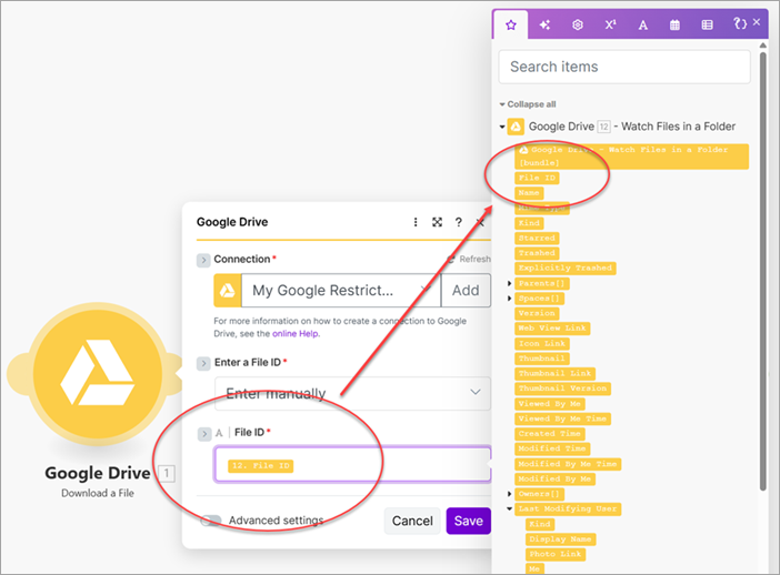 - Add a Google Drive - Download a File module and map its File ID parameter to the File ID from the Google Drive - Watch Files in a Folder module (Google Drive - Download a File).