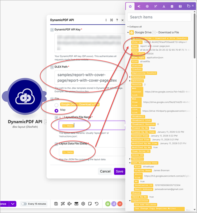 - Map the Google Drive - Download a File module's Name to LayoutData File Name and Data to Layout Data File (Data).