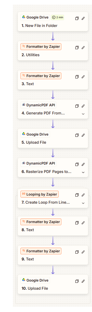In this tutorial, you created a complete end-to-end document automation workflow using the DynamicPDF API Zapier App. You started with a JSON layout data file stored in Google Drive, generated a dynamic PDF from a remote DLEX template, saved the resulting report, rasterized its pages into PNG images, and uploaded each image with properly constructed file names.