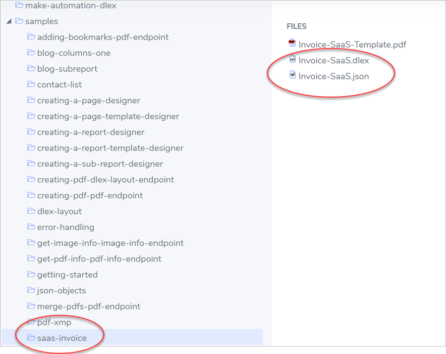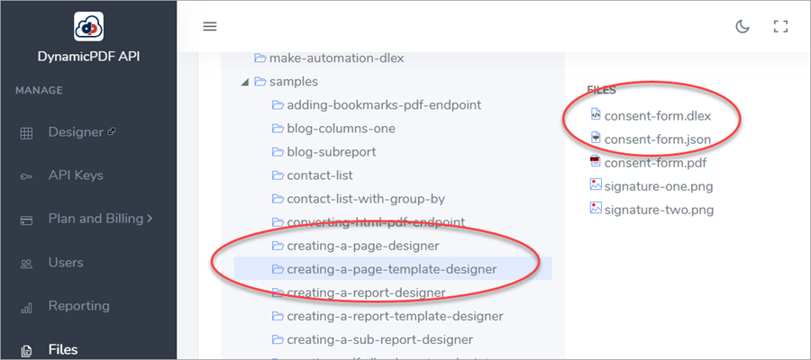You obtain the saas-invoice and creating-a-page-template-designer samples from the DynamicPDF API File Manager.