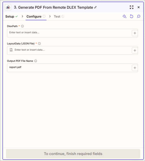 You now must map the DLEX file from DynamicPDF AP's File Manager to the DlexPath field and the local layout data JSON file to the Layoutdata field.