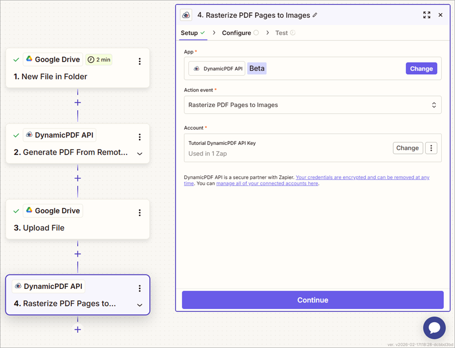 In this tutorial, you learn how to use the DynamicPDF API Zapier App by using the Generate PDF from Remote DLEX Template action and the Rasterize PDF Pages to Images action from the DynamicPDF API Zapier App. You build a flexible workflow that dynamically selects the correct template and constructs file names automatically, allowing the Zap to process multiple layout data files without hardcoded values.