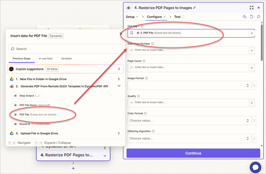 - Map the PDF file from the 2. Generate PDF From Remote DLEX Template in DynamicPDF API step to the PDF File field.