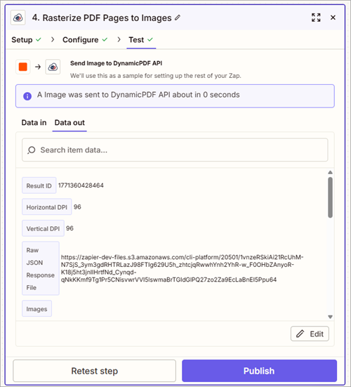 - Test step 3. Generate PDF From Remote DLEX Template by clicking Test step (or Retest step) to call the DynamicPDF API
