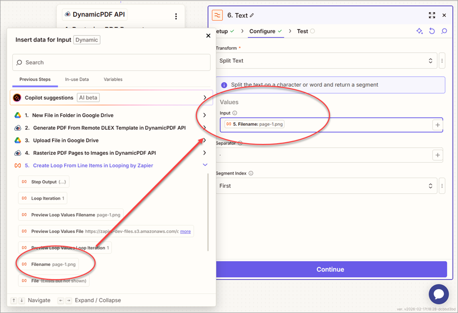 - From the 5. Create Loop From Line Items in Looping by Zapier step, map the filename variable to the Input field.