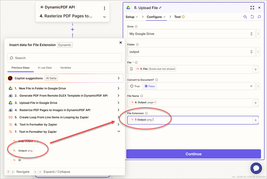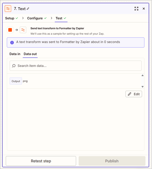 - Map the Output from the second 7. Text in Formatter by Zapier step to the File Extension field.