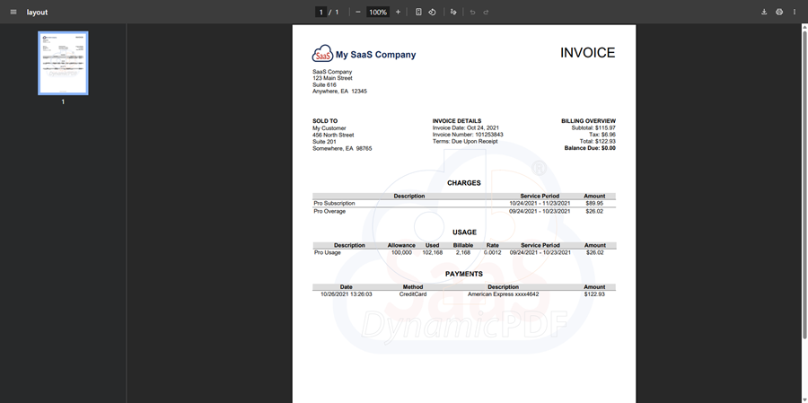 See the Create a SaaS Invoice sample for information on generating this report using DynamicPDF Designer (Create a SaaS Invoice).