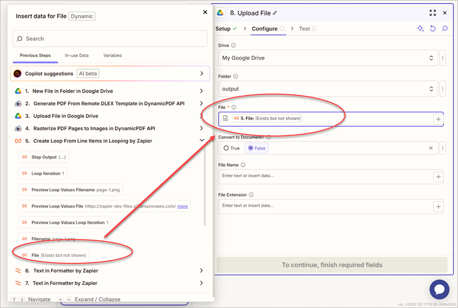 - Map File from the previous 1. New File in Folder in Google Drive step to the LayoutData (JSON File) field.