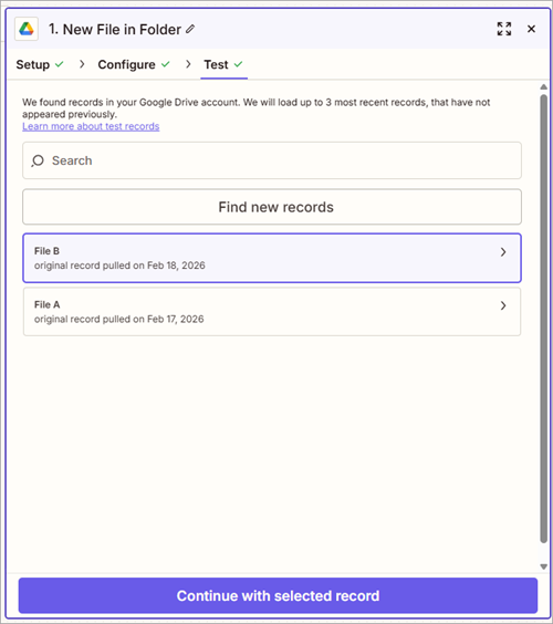 - Return to the New File in Folder trigger and click Find new records to find the newly uploaded file.