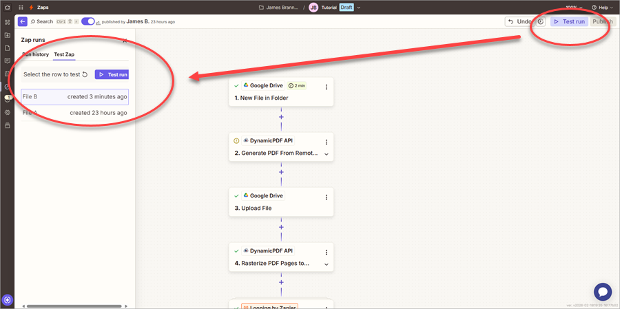 Up to now, you have either tested each step as you built the Zap or you tested the Zap using Test run. However, when testing in this way, Zapier optimizes processing by using only the manually obtained file from previous steps. Moreover, it only executes the first iteration of a loop. To fully test your Zap, you must publish the Zap.
