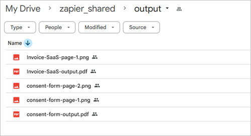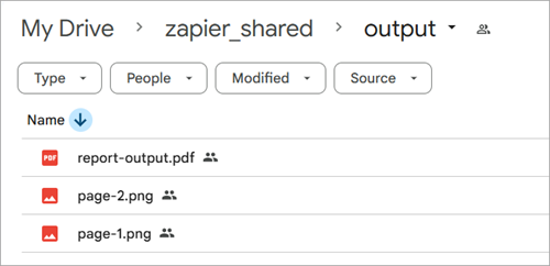 - Wait for the Zap to run and you should see the two reports and its associated rasterized pages, correctly named, outputted to Google Drive.