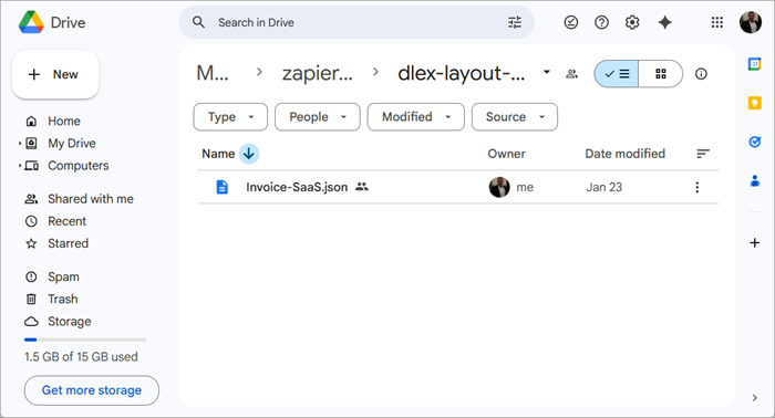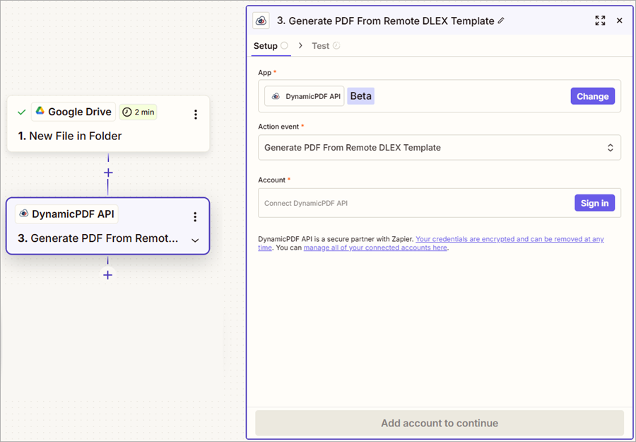 Your Zap will use the JSON data file from Google Drive and the DLEX template path from the DynamicPDF API File Manager when constructing the Zap. Now that we have ensured the DLEX template renders correctly and we have downloaded the JSON layout data, let's create the Zap.