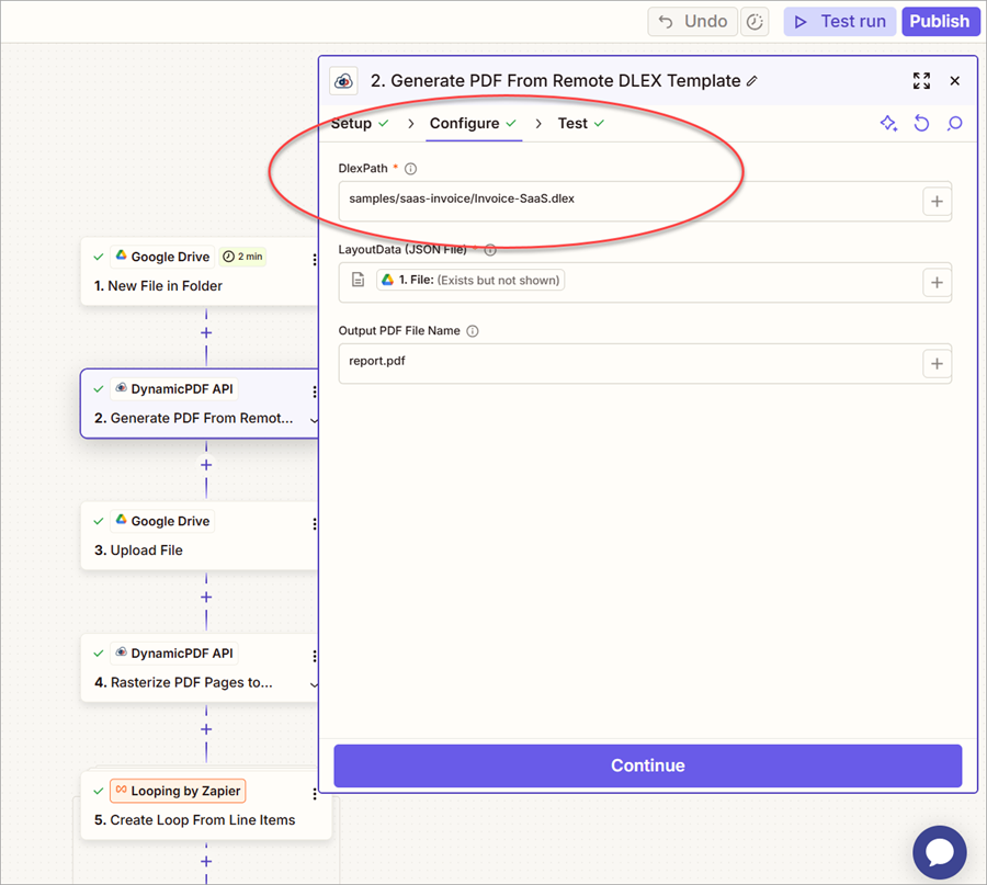 This configuration only works when the uploaded JSON layout data corresponds specifically to the Invoice-SaaS.dlex template. Because each JSON layout data file must match its associated DLEX template, hardcoding the DlexPath prevents the Zap from correctly processing multiple templates.