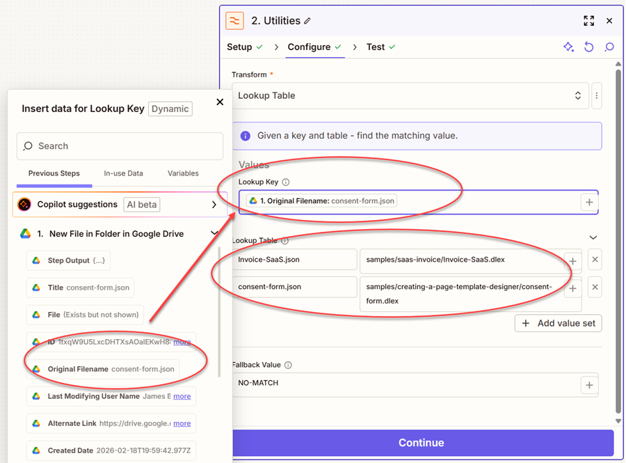 - Map the Original Filename from the 1. New File in Folder in Google Drive trigger .